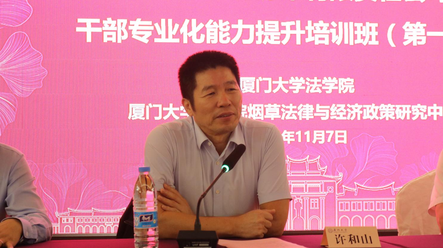 许和山在致辞中向学员介绍了厦门大学悠久的办学历史,优良的办学传统,以及厦门大学办学以来形成的“爱国、革命、自强、科学”的四种精神,并介绍了法学院的基本情况。他也对大家给予厦门大学法学院烟草法律与经济政策研究中心的大力支持表示衷心感谢。
