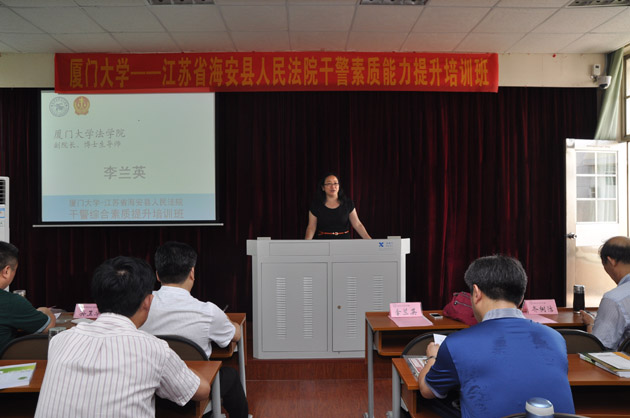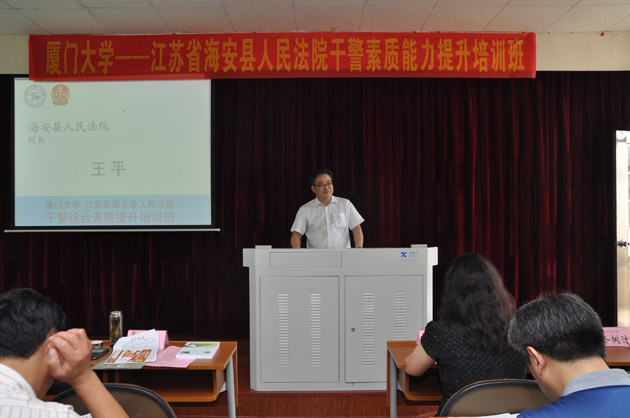 2014年7月8日上午,第三期“厦门大学法学院——江苏省海安县人民法院干警素质能力提升培训班”在厦门大学法学院A栋302教室隆重开班。我院副院长兼社会培训中心主任李兰英教授致欢迎词,江苏省海安县人民法院王平院长讲话。