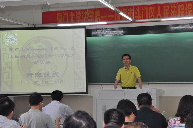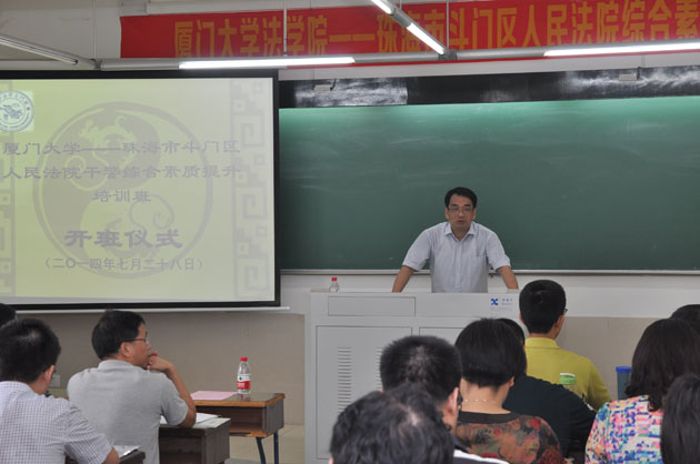 2014年7月28日上午,“厦门大学法学院——珠海市斗门区人民法院综合素能提升研修班”第二期在厦门大学法学院A栋303教室隆重开班。我院院长徐崇利教授致欢迎词,珠海市斗门区人民法院黄伟锋院长做动员讲话。
