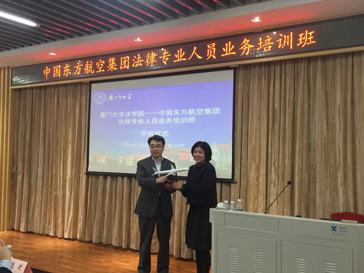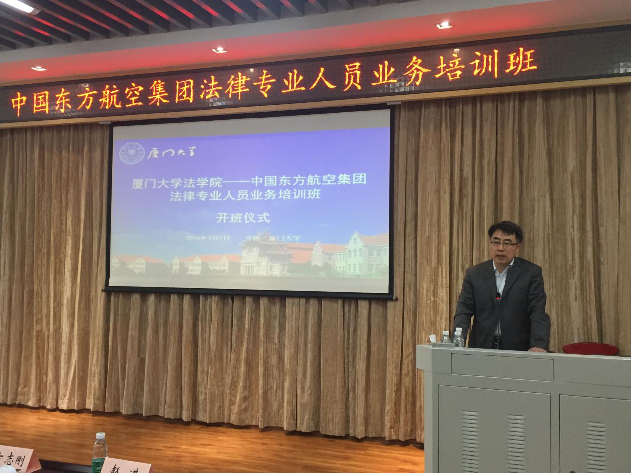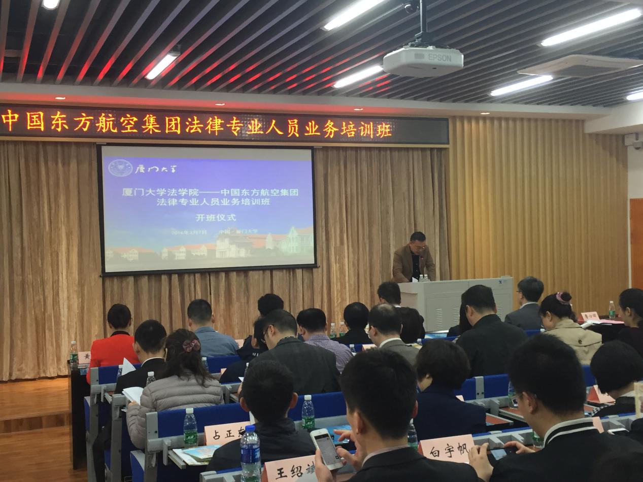 2016年3月7日上午,由厦门大学法学院、中国东方航空集团公司联合举办的“中国东方航空集团法律专业人员业务培训班”在厦门大学法学院B137隆重开班。我校詹心丽副校长致欢迎致辞、中国东方航空集团公司总法律顾问郭俊秀校友作开班动员讲话。我院党委书记李智勇、院长宋方青、副院长朱炎生出席仪式,李智勇书记主持仪式。